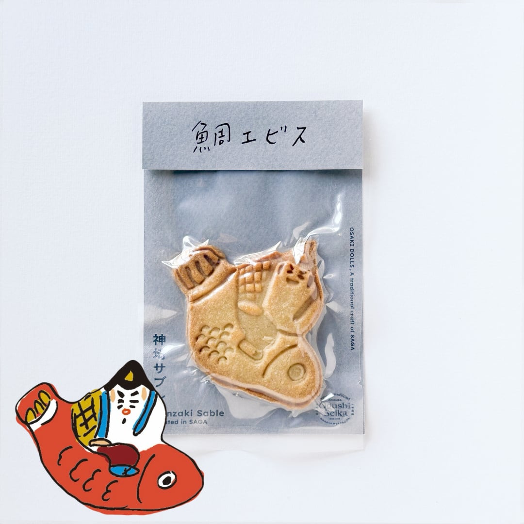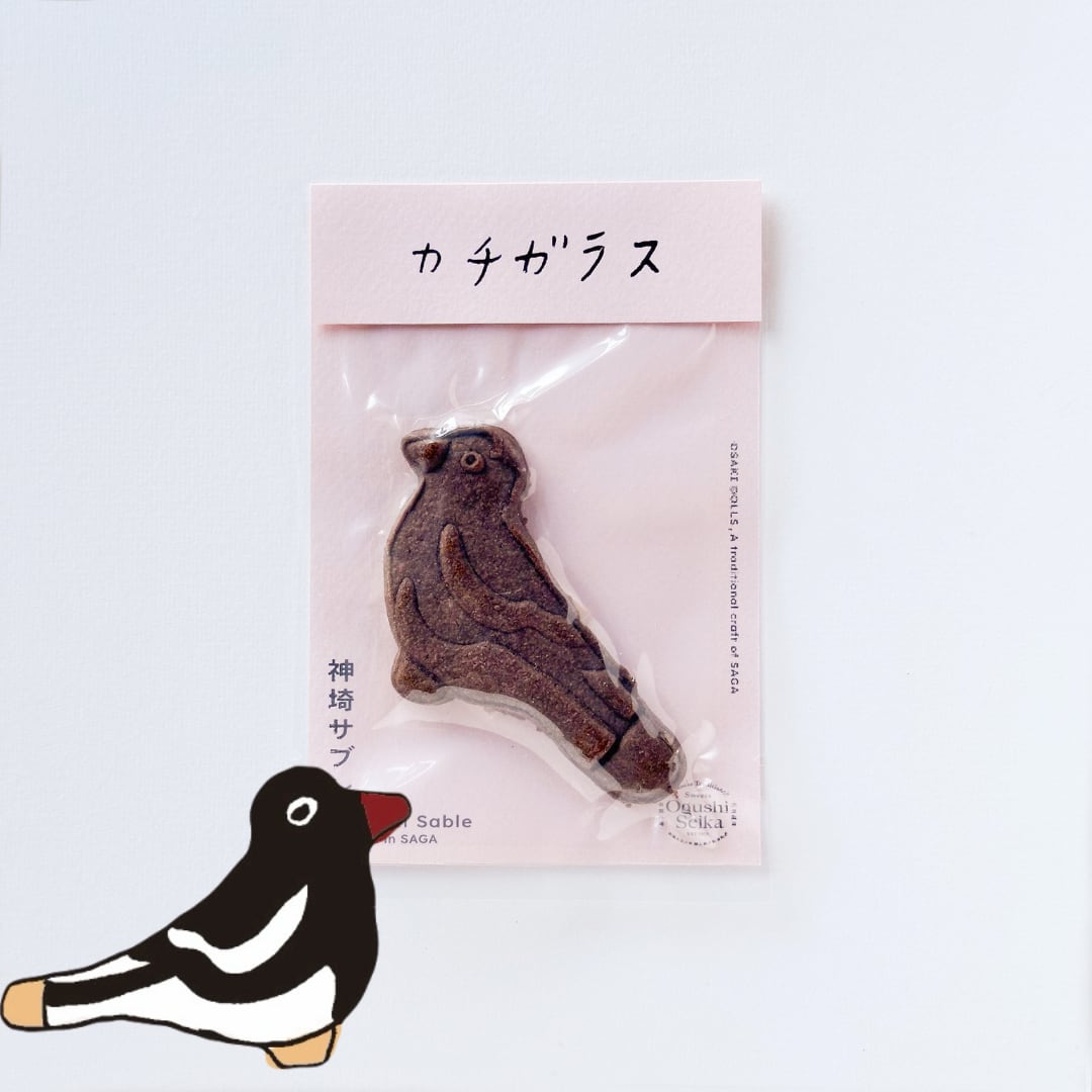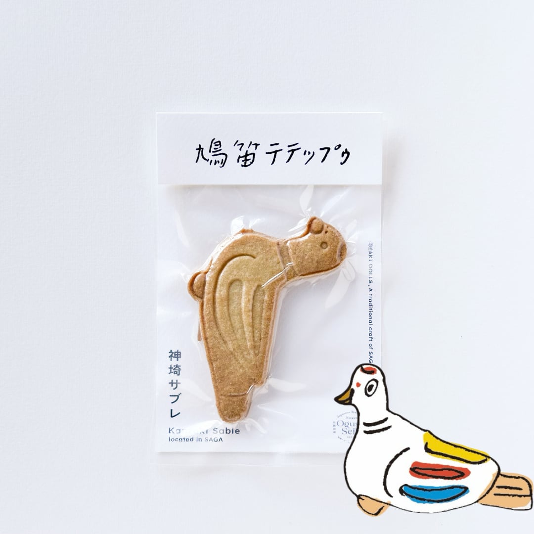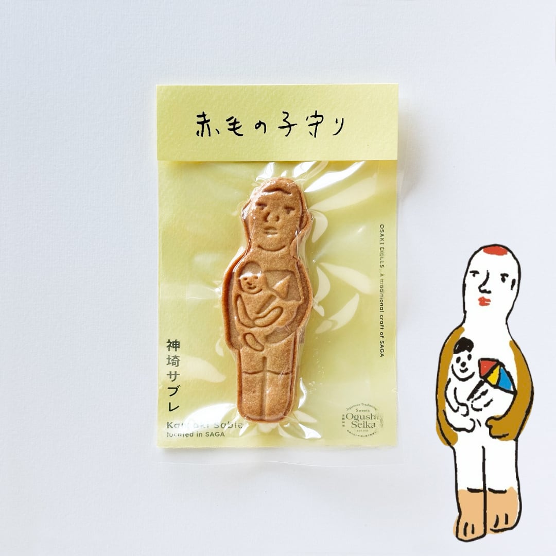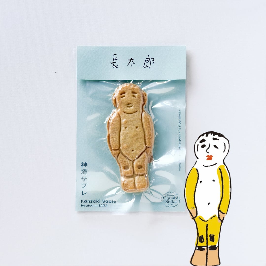 佐賀県神埼市に伝わる郷土玩具・尾崎人形の「長太郎」「鳩笛テテップゥ」「赤毛の子守り」「鯛エビス」の脱力系ご縁起サブレ。佐賀県産小麦、きび砂糖、バターなど素材にもこだわったやさしい味わいです。勝負に勝つ!「カチガラス(期間限定)」のカカオサブレは、必勝祈願の贈り物にも。